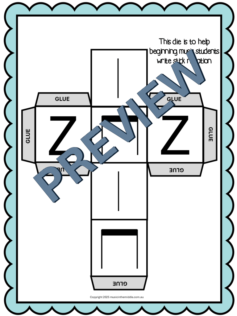 This is a fun game of chance to support your beginner students to write simple rhythm notation. The focus rhythms are ta, ti-ti and za and the game can be adaptable to use stick notation, standard music notation or the rhythm words.