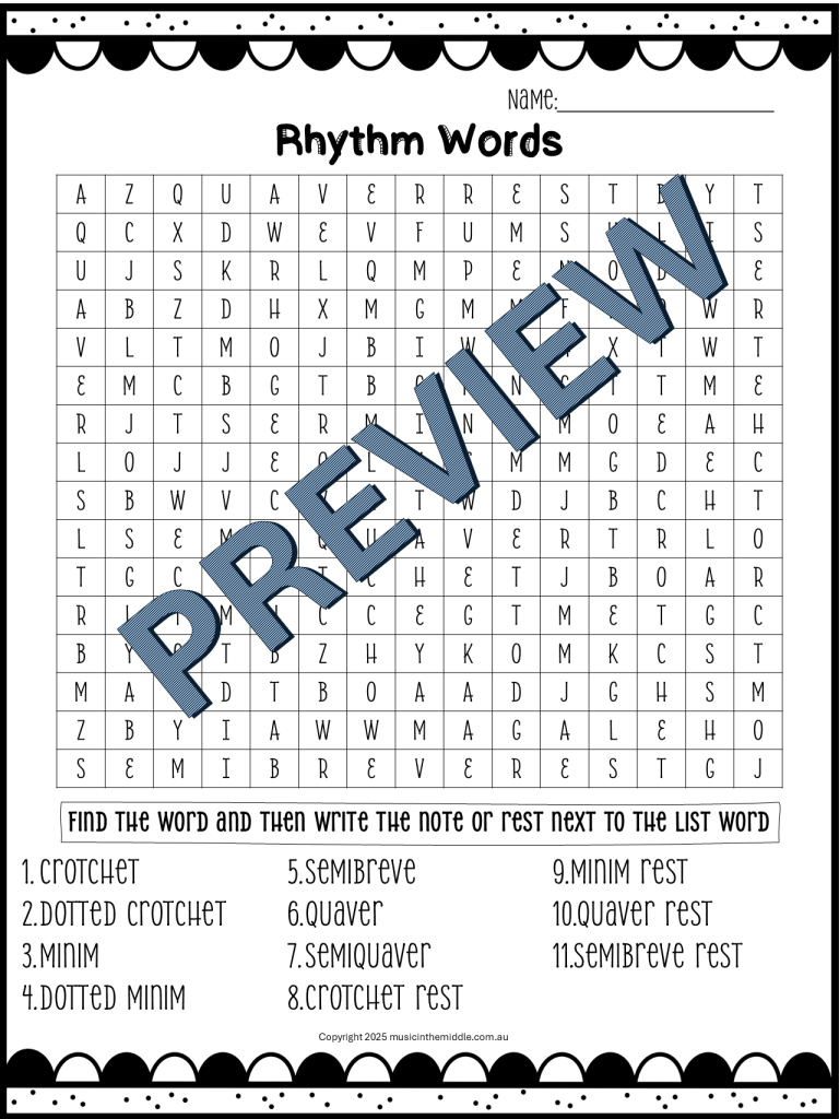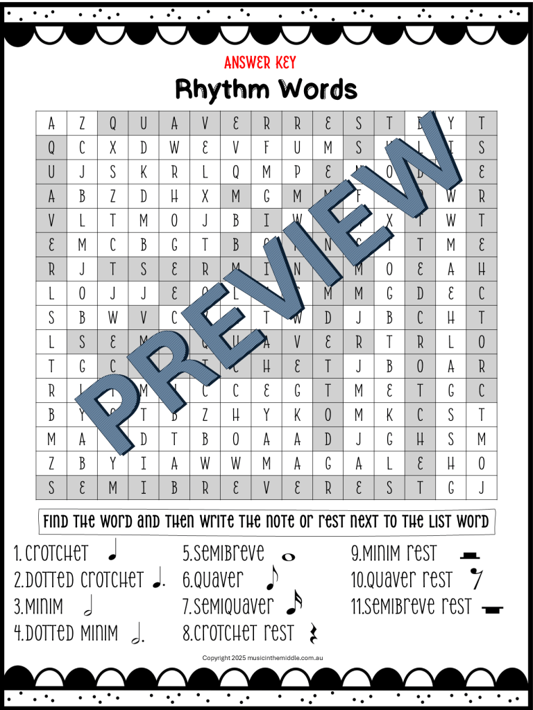 Whether you are looking for an introduction to teach a new rhythm notation, more exposure to notation or a revision activity, this Rhythm Word Find hits the spot.